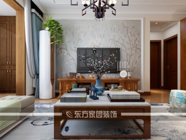 本案以新中式方案为题材。客厅运用木色主